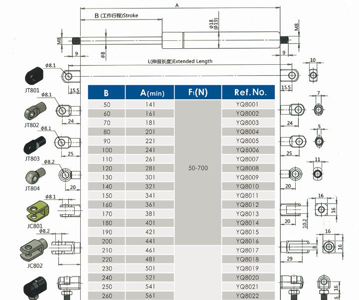 注:由于氣彈簧是非標(biāo)準(zhǔn)的,以上僅為型號(hào)的一部分。我們可以根據(jù)客戶的要求定制。